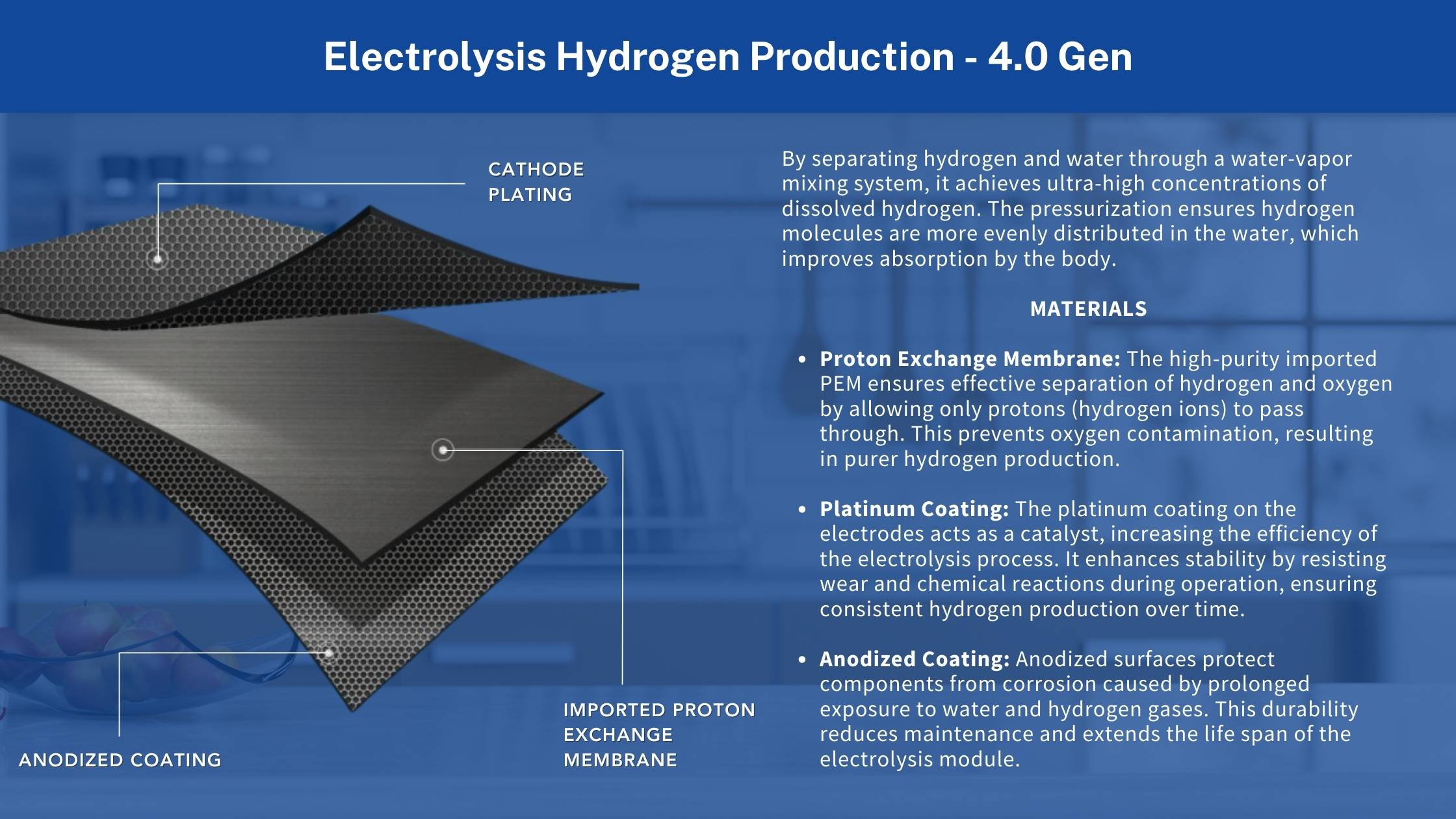 Powered by SPE Electrolysis Technology 4.0, this machine generates pure, high-concentration molecular hydrogen through a durable, hospital-grade electrolysis system.