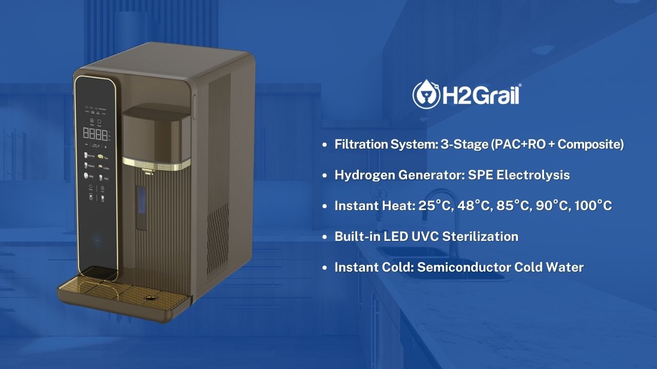 H2Grail Countertop W25G – Pipe-Line (No Tank) 3 Stage RO Hydrogen Water Dispenser with UVC Sterilization – USA 110v